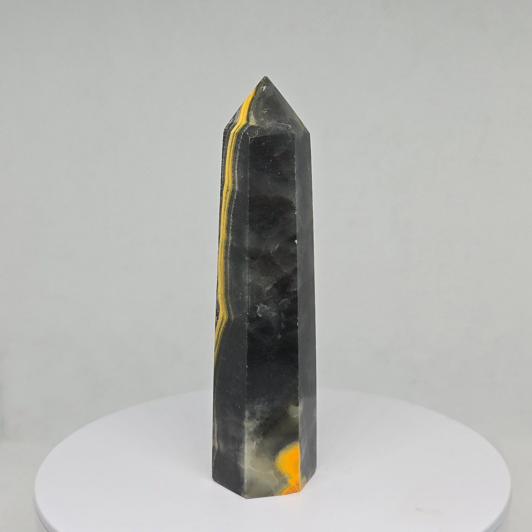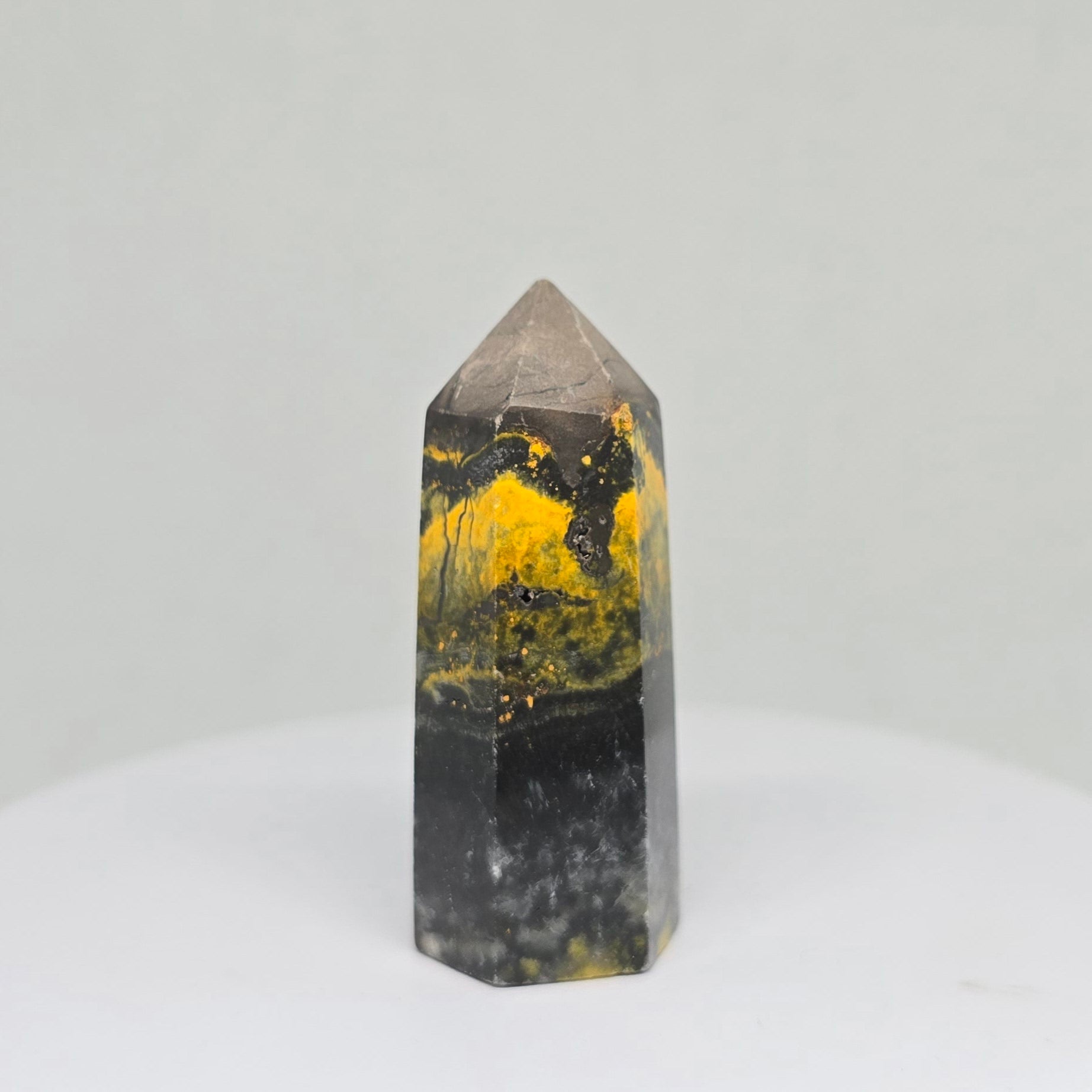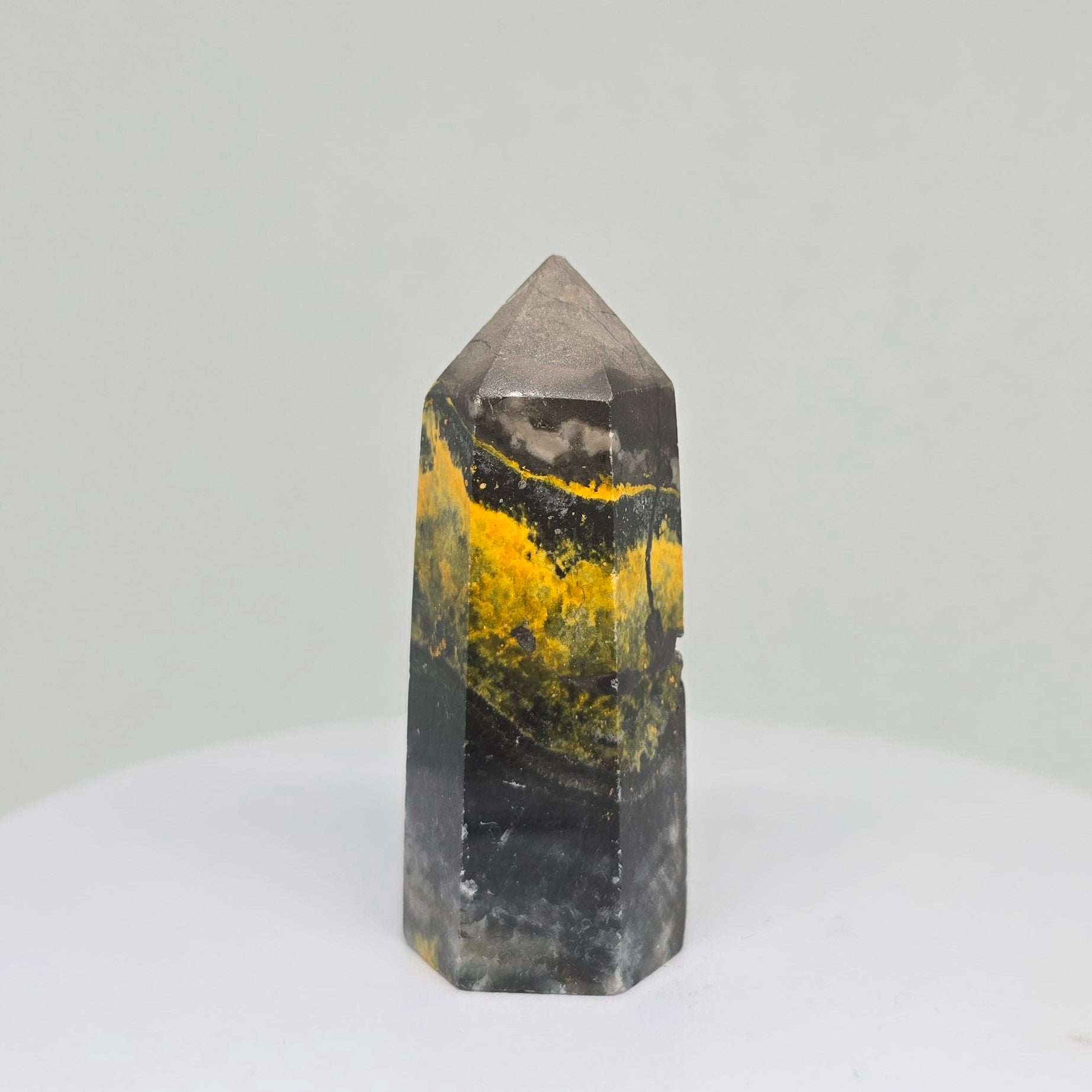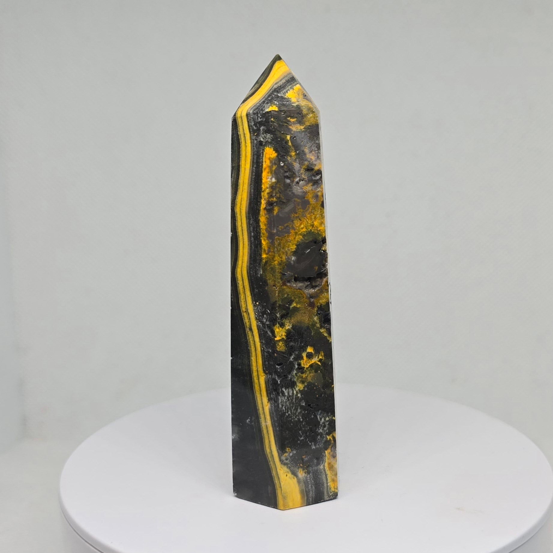 Bumblebee jaspis is een zeldzame edelsteen die opvalt door zijn levendige gele, oranje en zwarte strepen, die doen denken aan de kleuren van een hommel. Bumblebee jaspis wordt voornamelijk gevonden in de regio's rondom de vulkanen van West-Java, Indonesië. De steen ontstaat in de buurt van zwavelrijke warme bronnen en is technisch gezien geen echte jaspis, maar een mix van vulkanische materialen, zwavel en aragoniet. Door de unieke geologische omstandigheden van dit gebied heeft bumblebee jaspis zijn karakteristieke strepen en levendige kleuren. Vanwege de beperkte vindplaatsen en de uitdagende mijnomstandigheden is deze steen relatief zeldzaam en gewild.