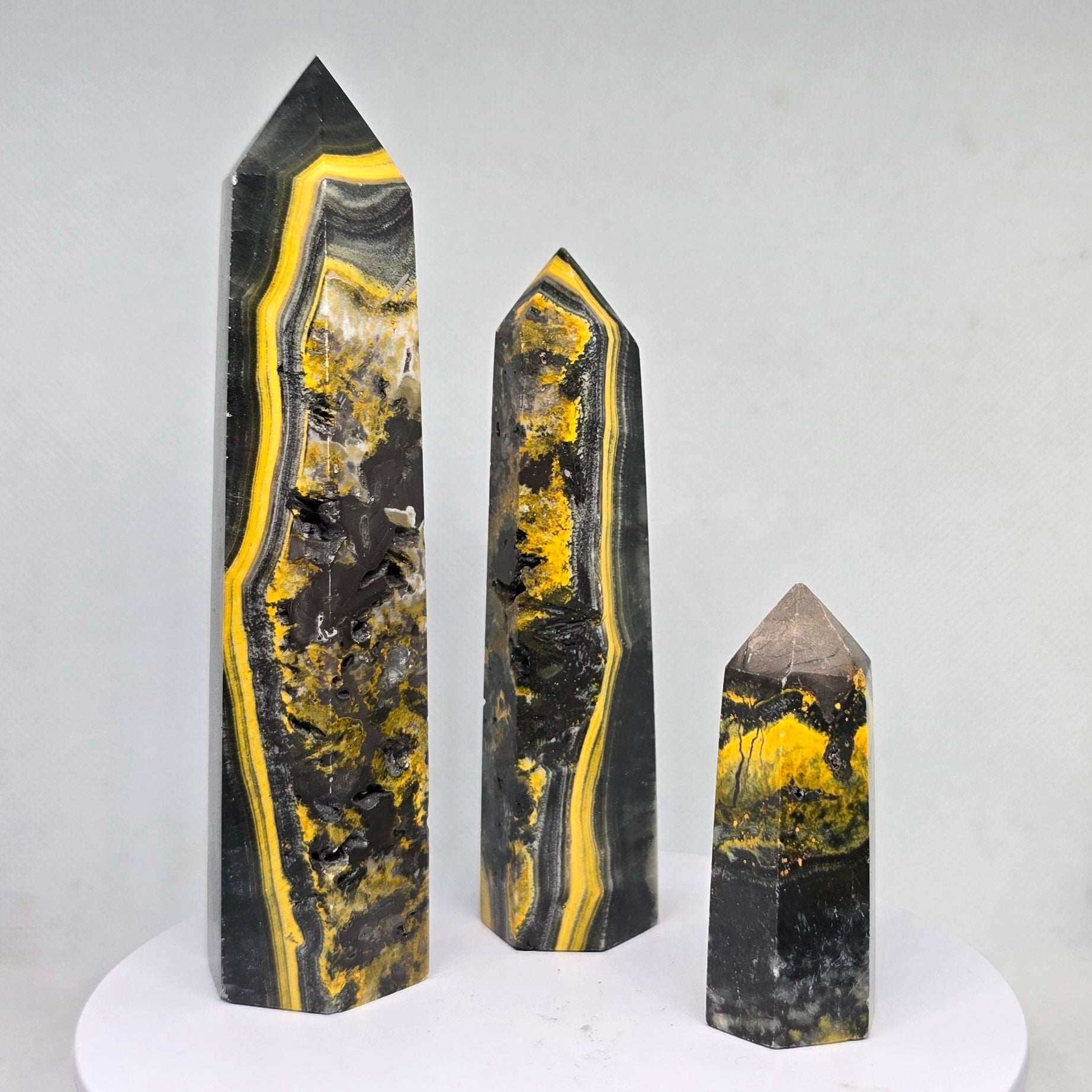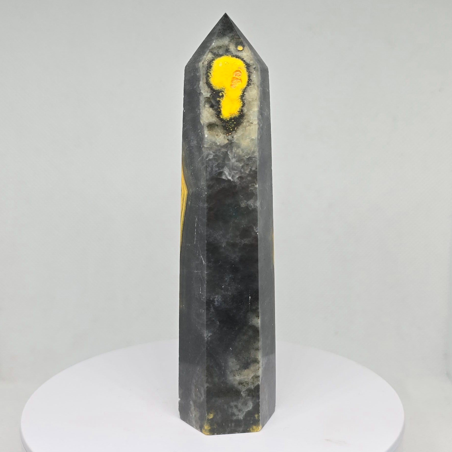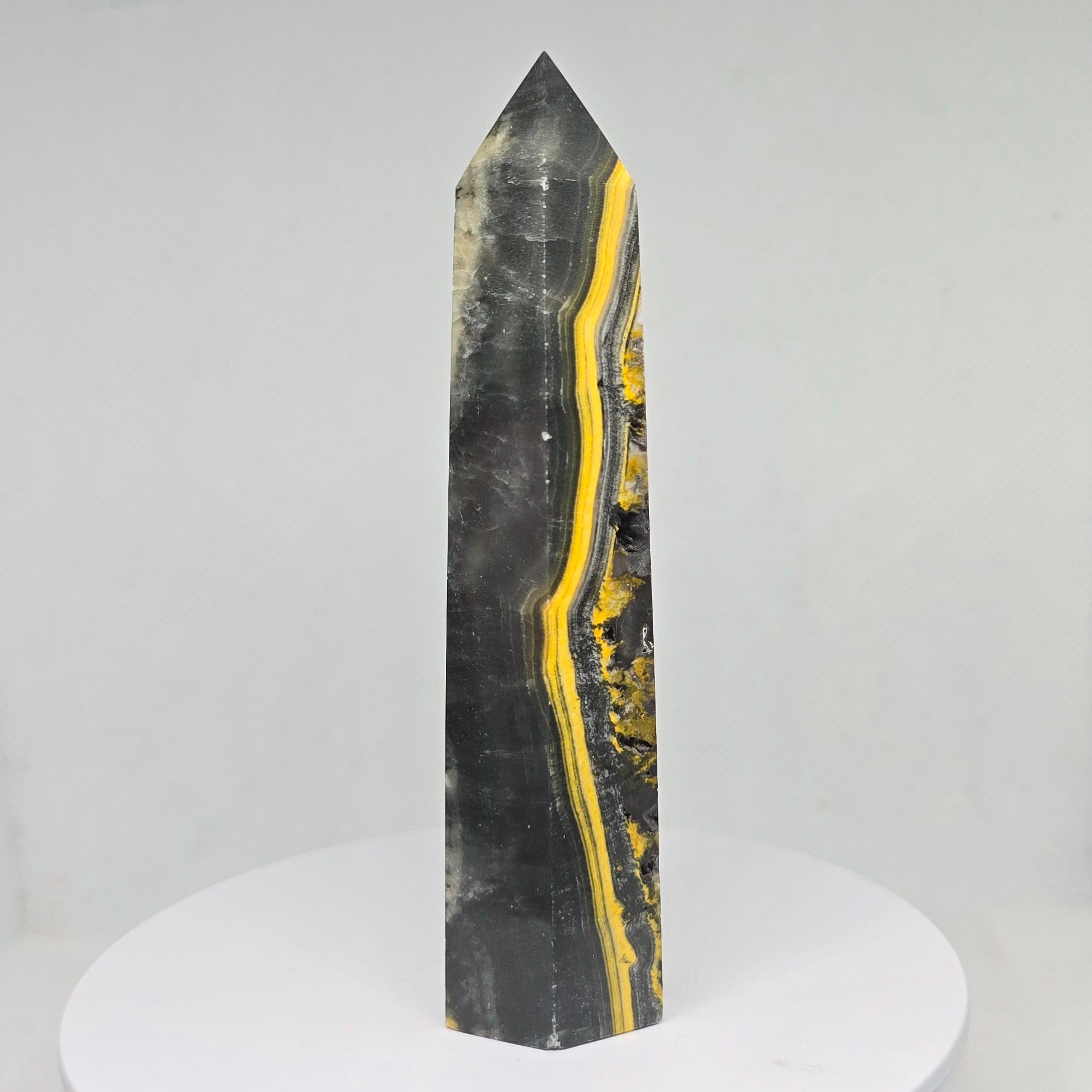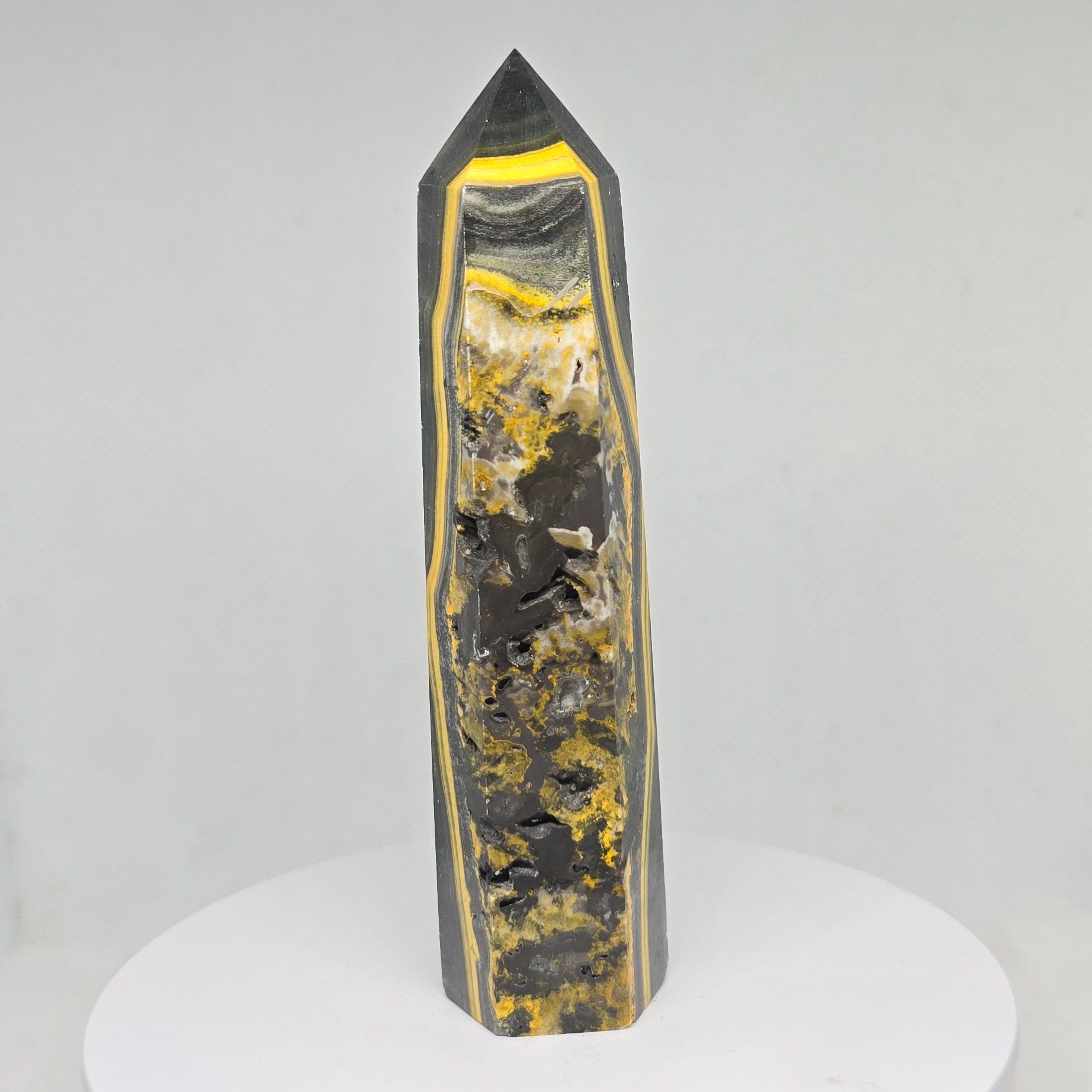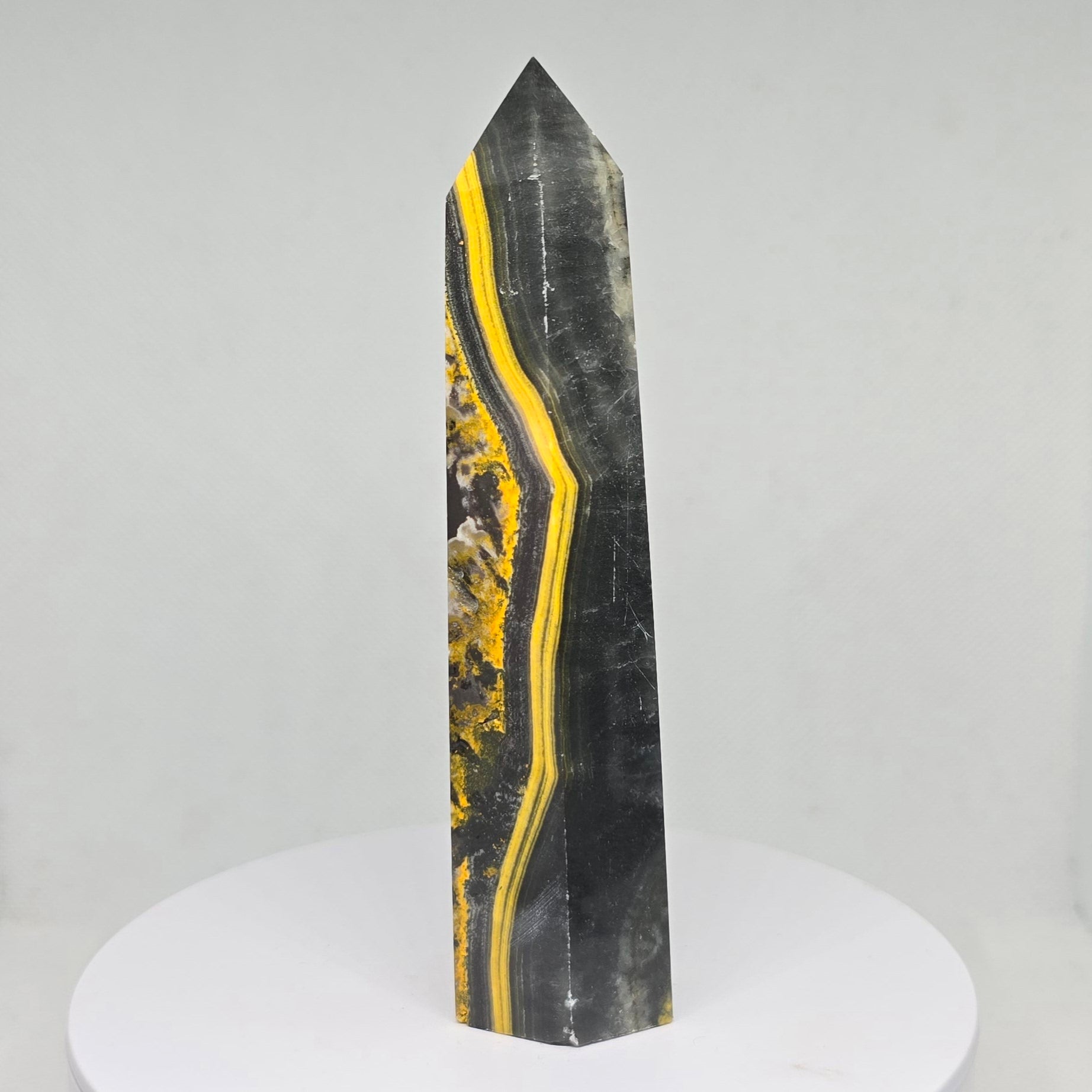 Bumblebee jaspis is een zeldzame edelsteen die opvalt door zijn levendige gele, oranje en zwarte strepen, die doen denken aan de kleuren van een hommel. Bumblebee jaspis wordt voornamelijk gevonden in de regio's rondom de vulkanen van West-Java, Indonesië. De steen ontstaat in de buurt van zwavelrijke warme bronnen en is technisch gezien geen echte jaspis, maar een mix van vulkanische materialen, zwavel en aragoniet. Door de unieke geologische omstandigheden van dit gebied heeft bumblebee jaspis zijn karakteristieke strepen en levendige kleuren. Vanwege de beperkte vindplaatsen en de uitdagende mijnomstandigheden is deze steen relatief zeldzaam en gewild.