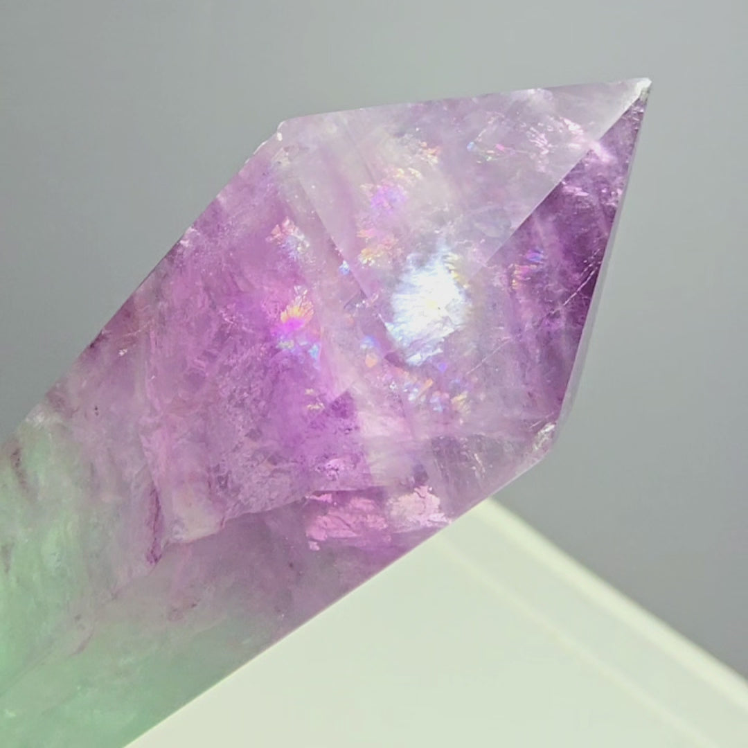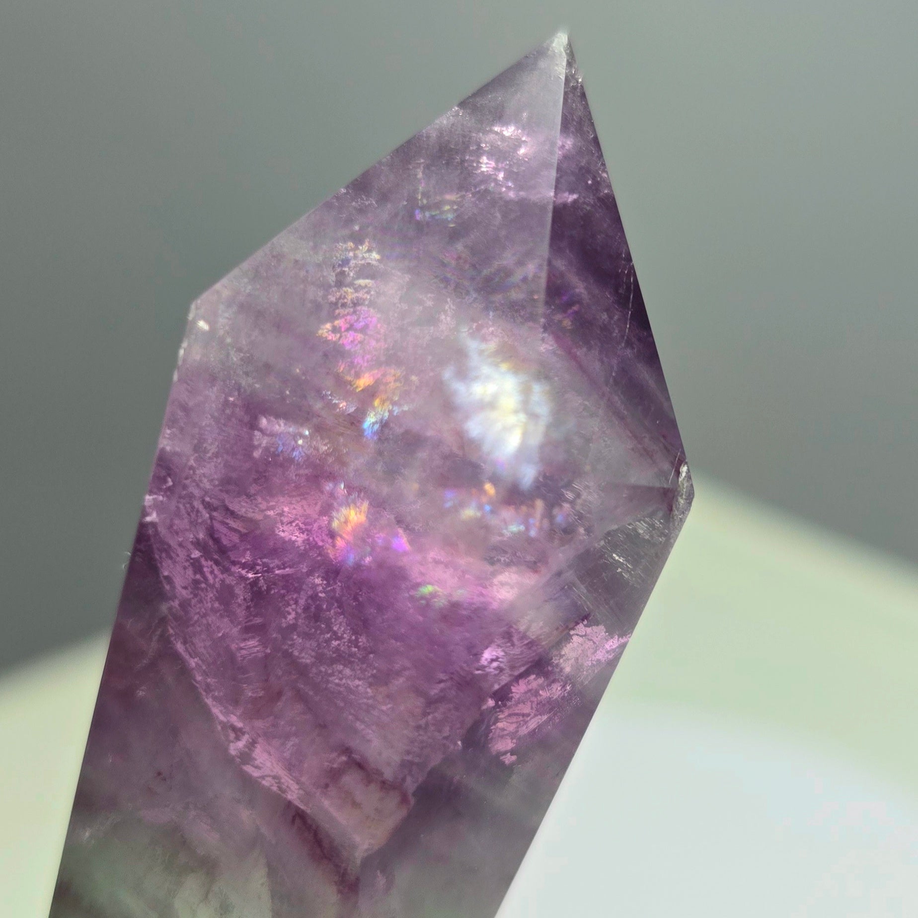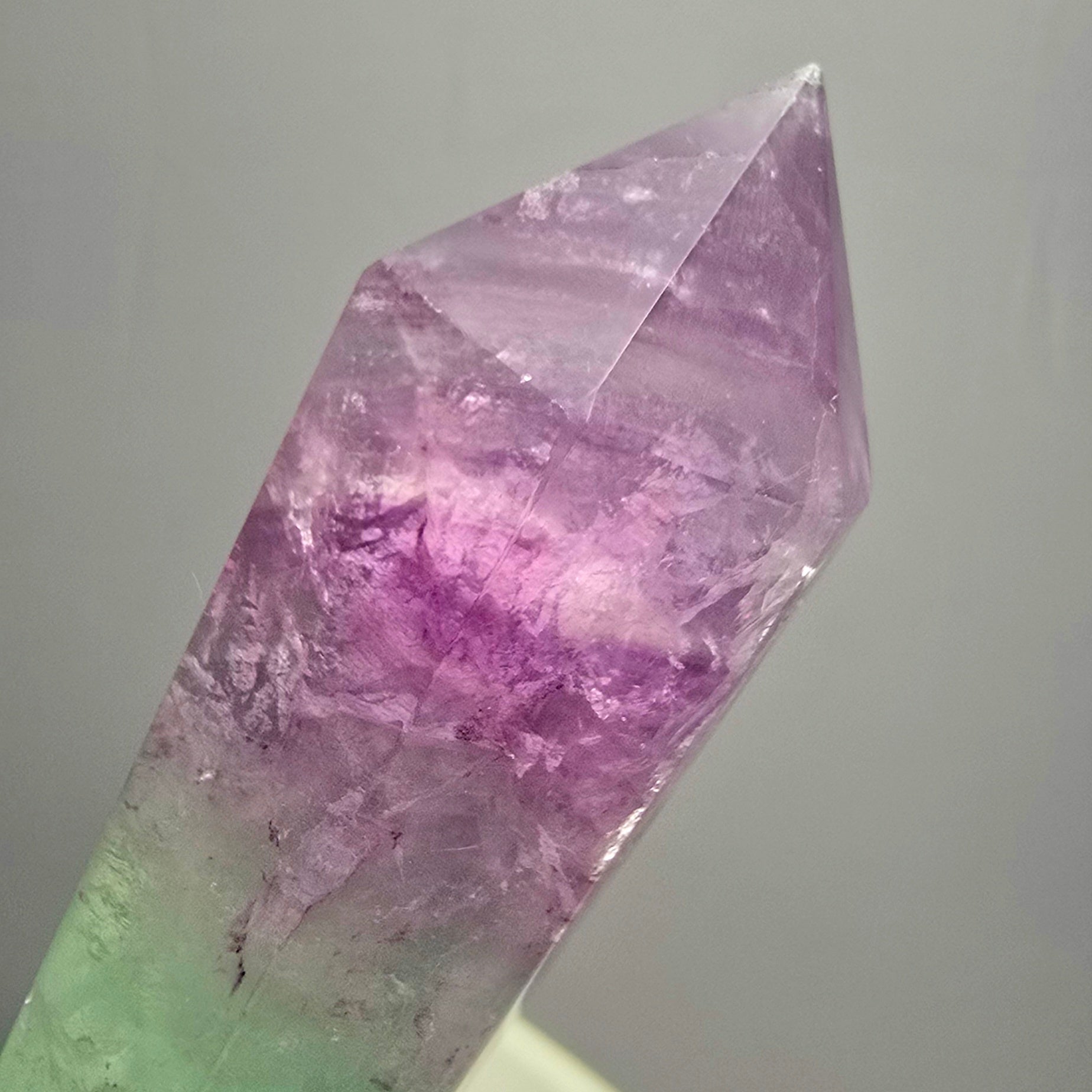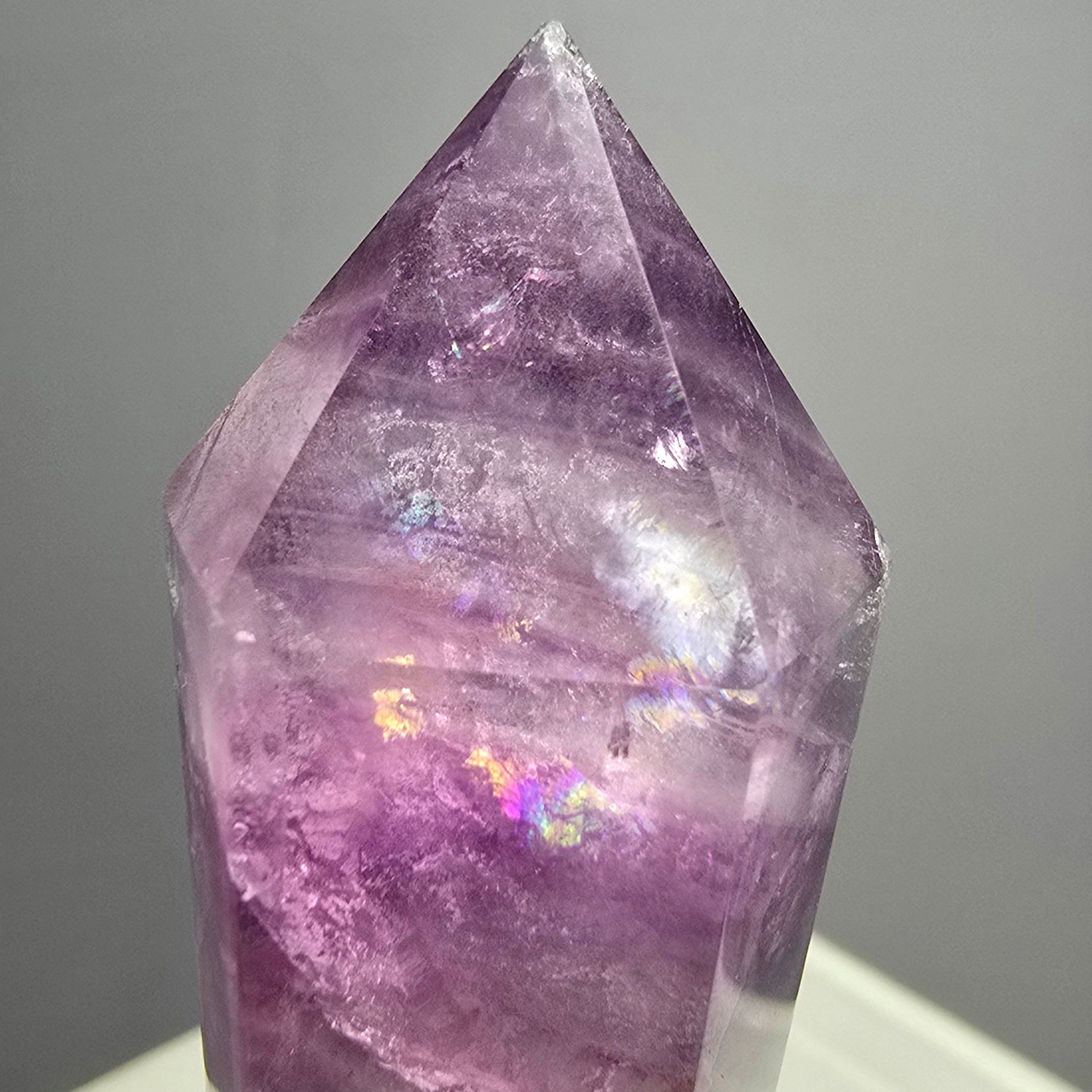 Paars of violet fluoriet: geassocieerd met het kruinchakra, bevordert spiritueel bewustzijn en verbinding.