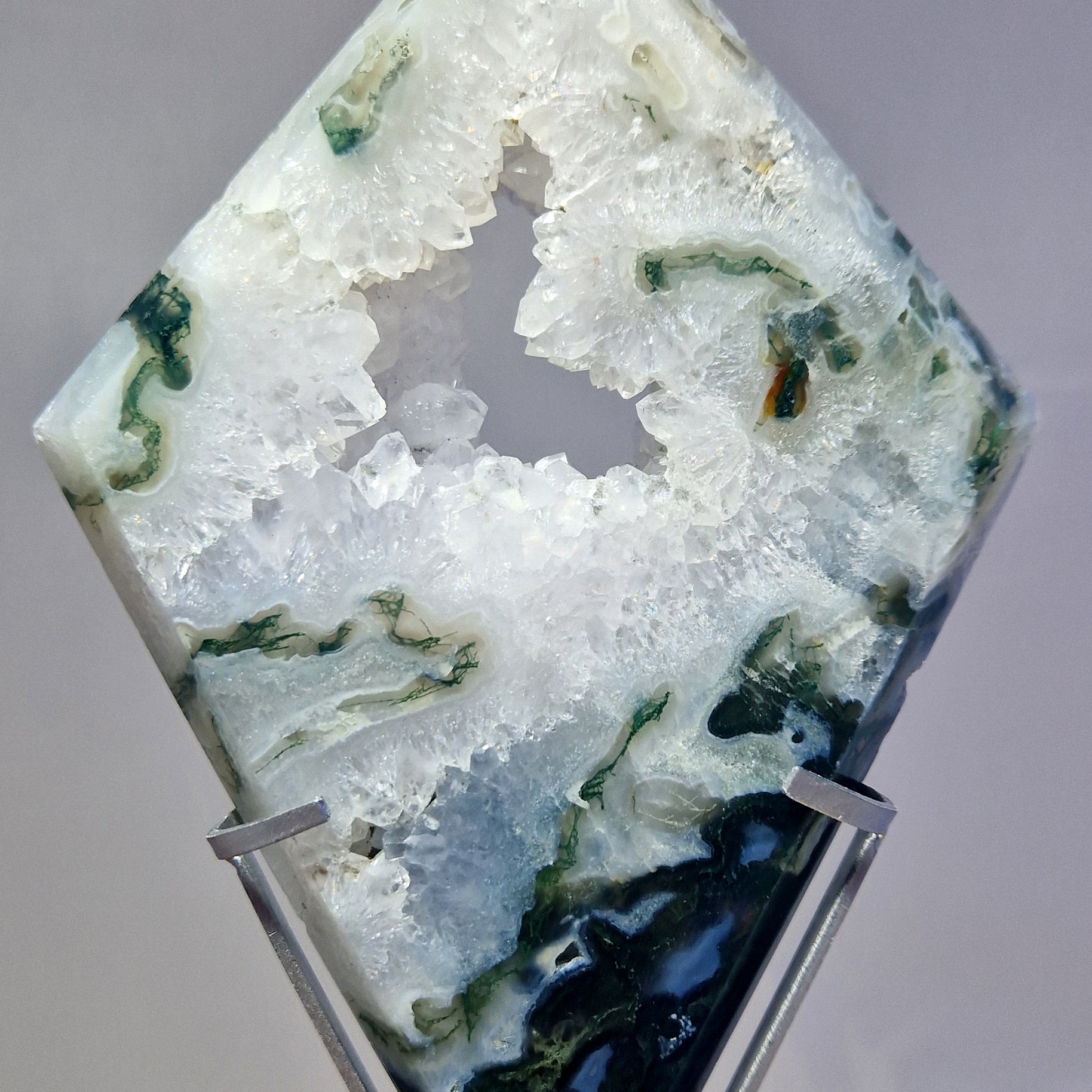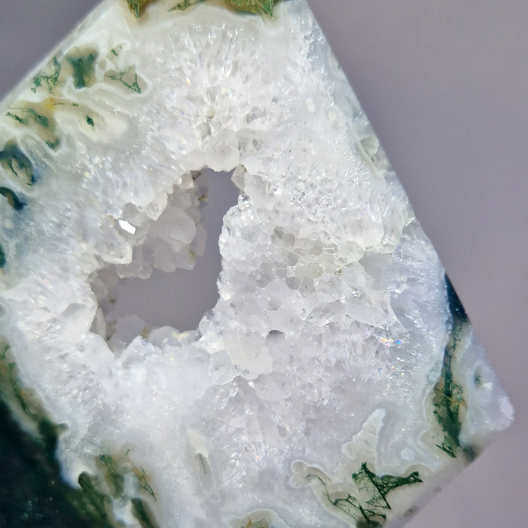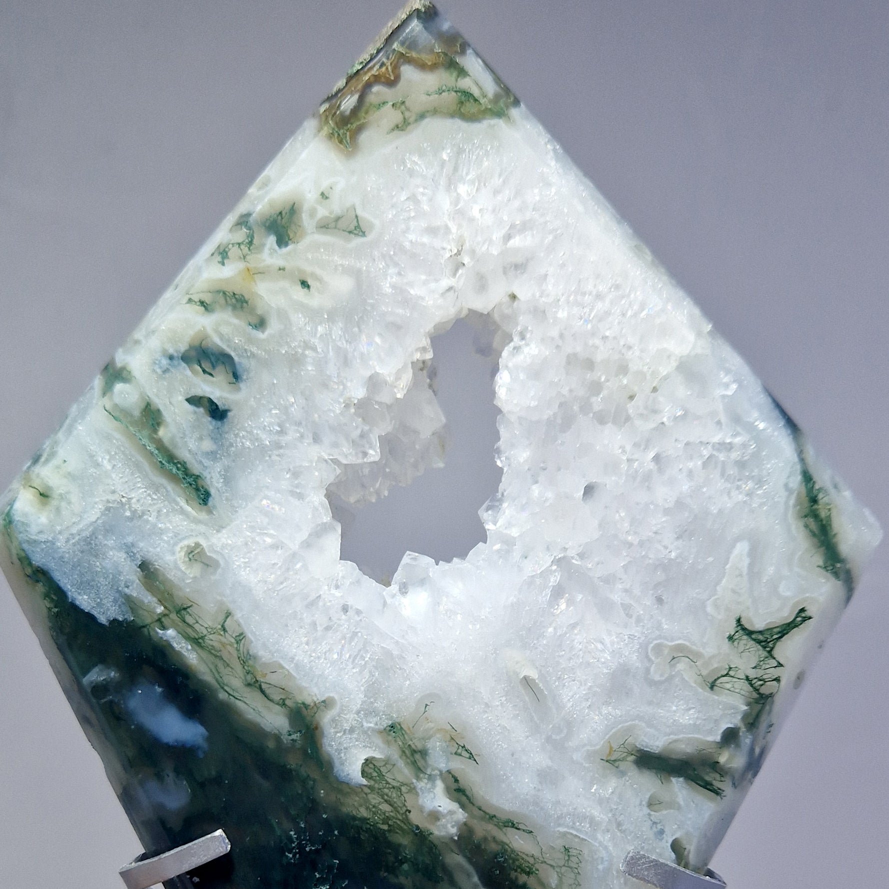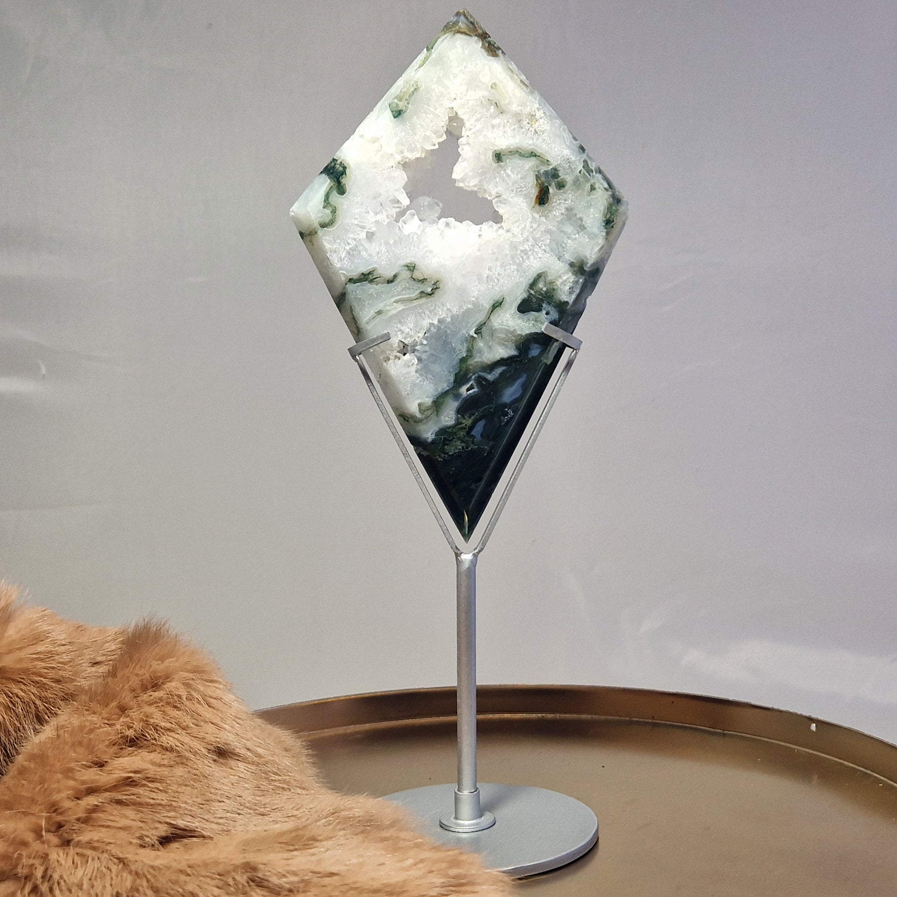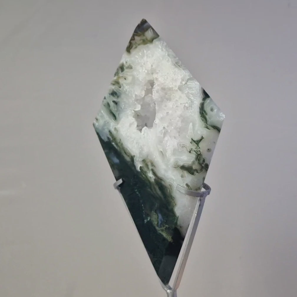 Mosagaat wordt geassocieerd met liefde, mededogen, evenwicht en harmonie. Er wordt ook aangenomen dat het een kalmerend en aardend effect heeft, waardoor het nuttig is voor het verminderen van stress en het bevorderen van emotioneel evenwicht. Het wordt vaak geassocieerd met de natuur en er wordt gedacht dat het de verbinding met de natuurlijke wereld versterkt en wordt beschouwd als een steen van overvloed. Er wordt gezegd dat het welvaart en succes aantrekt. Hoewel de associaties tussen kristallen en chakra's per beoefenaar kunnen variëren, wordt Mosagaat gewoonlijk in verband gebracht met de hartchakra.