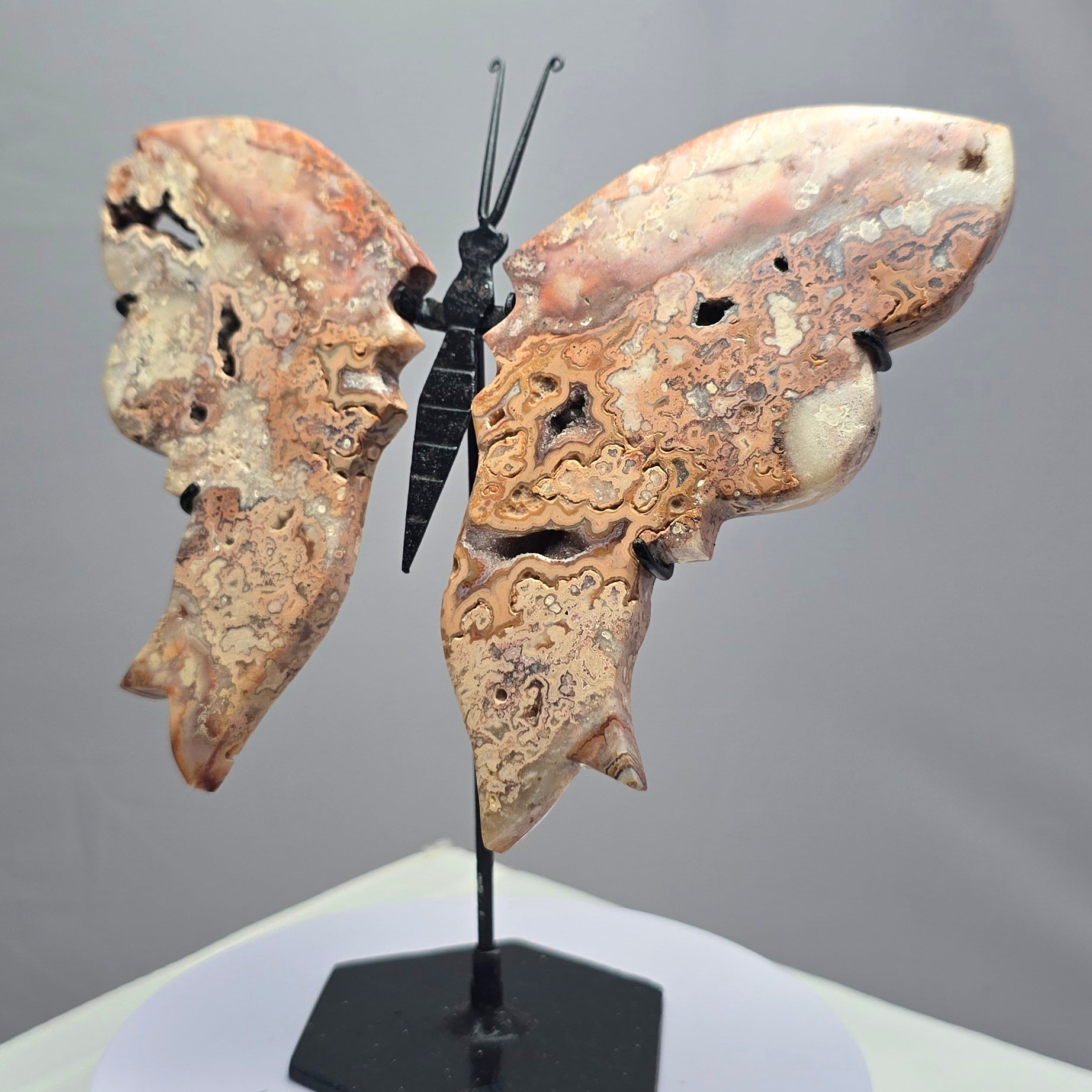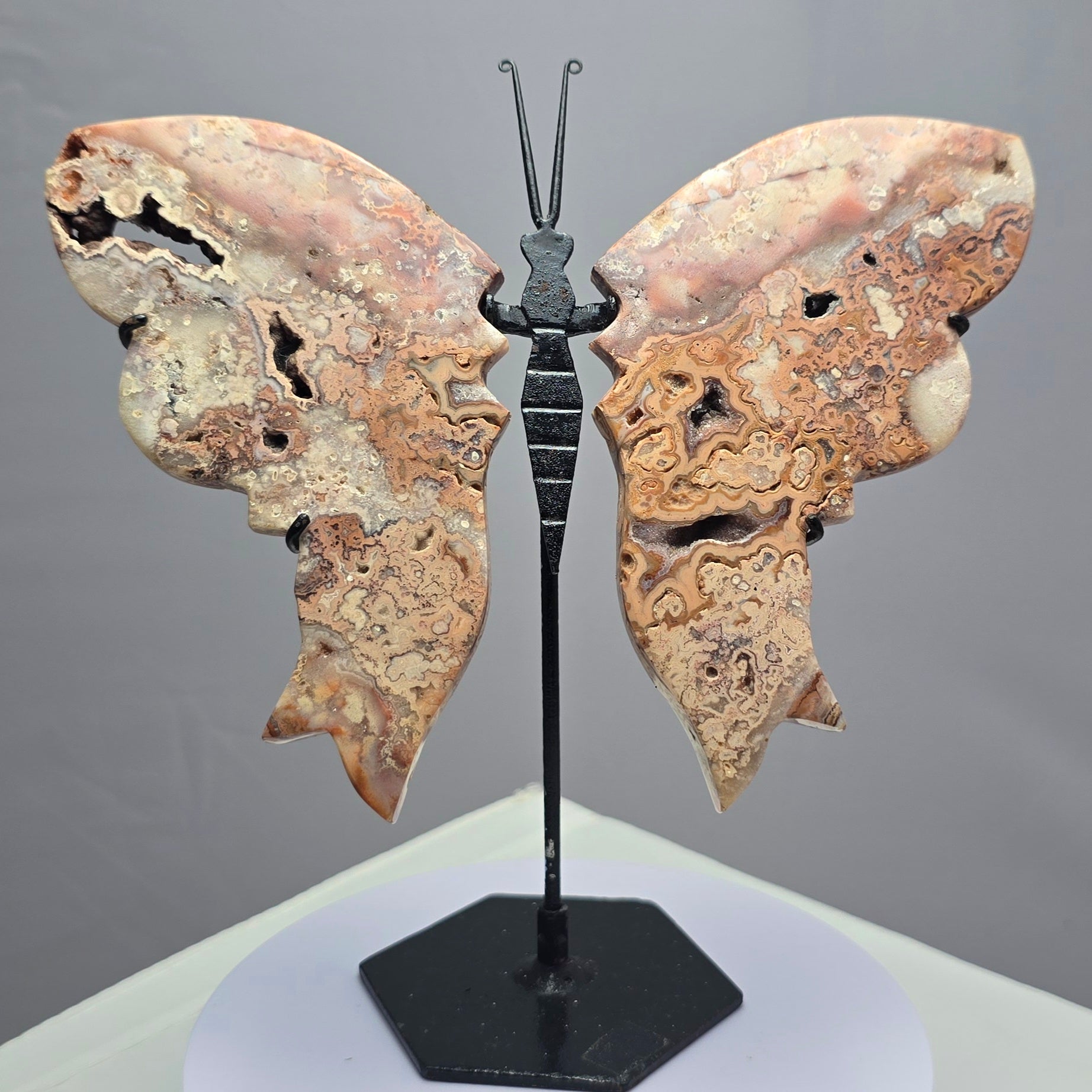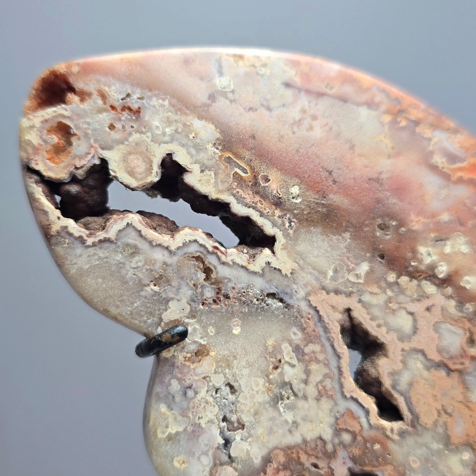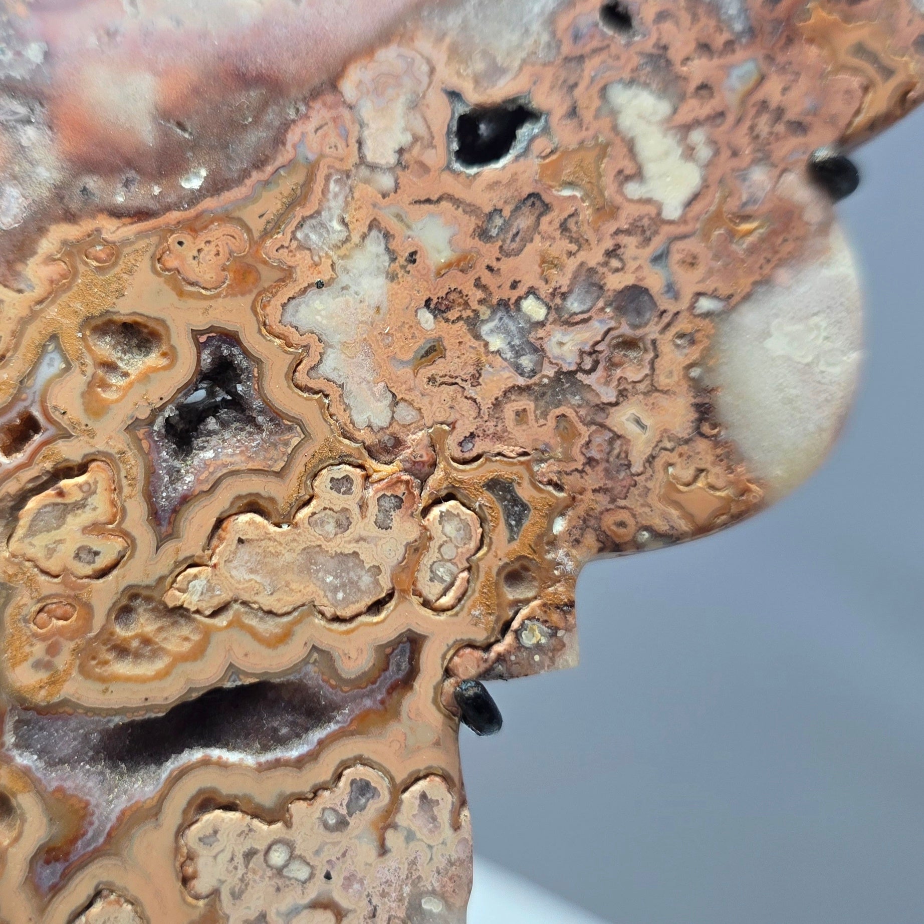 Agaat zelf is een soort chalcedoon, een variëteit van kwarts. Het staat bekend om zijn fijnkorrelige structuur en vertoont vaak opvallende banden of patronen. Bloem Agaat is populair vanwege zijn kenmerkende bloempatronen, die lijken op bloeiende bloemen of botanische formaties. De patronen bevatten vaak delicate, ingewikkelde insluitsels die op bloemblaadjes, varens of andere natuurlijke motieven kunnen lijken. Deze specifieke agaat wordt ook wel "Cotton Candy Agate" genoemd.